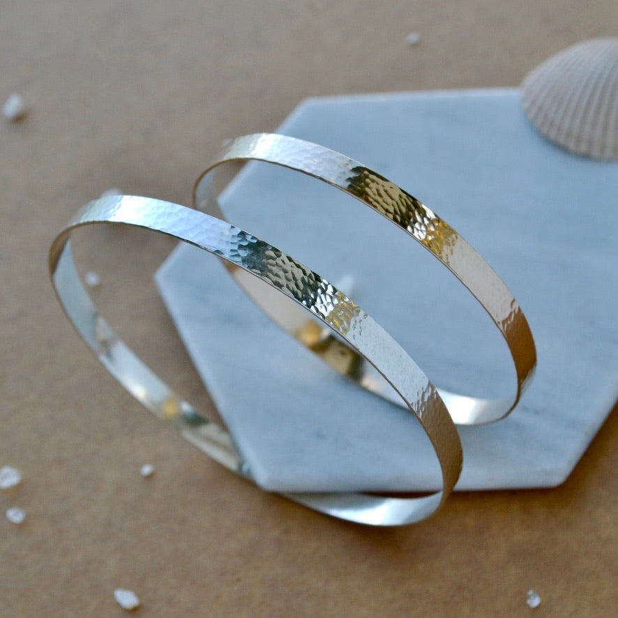 Our modern Whitecaps Bangle Bracelet is a shining addition to any style. This dappled bracelet is handmade in 1/4" wide wire and riveted closed into a circle bangle.
