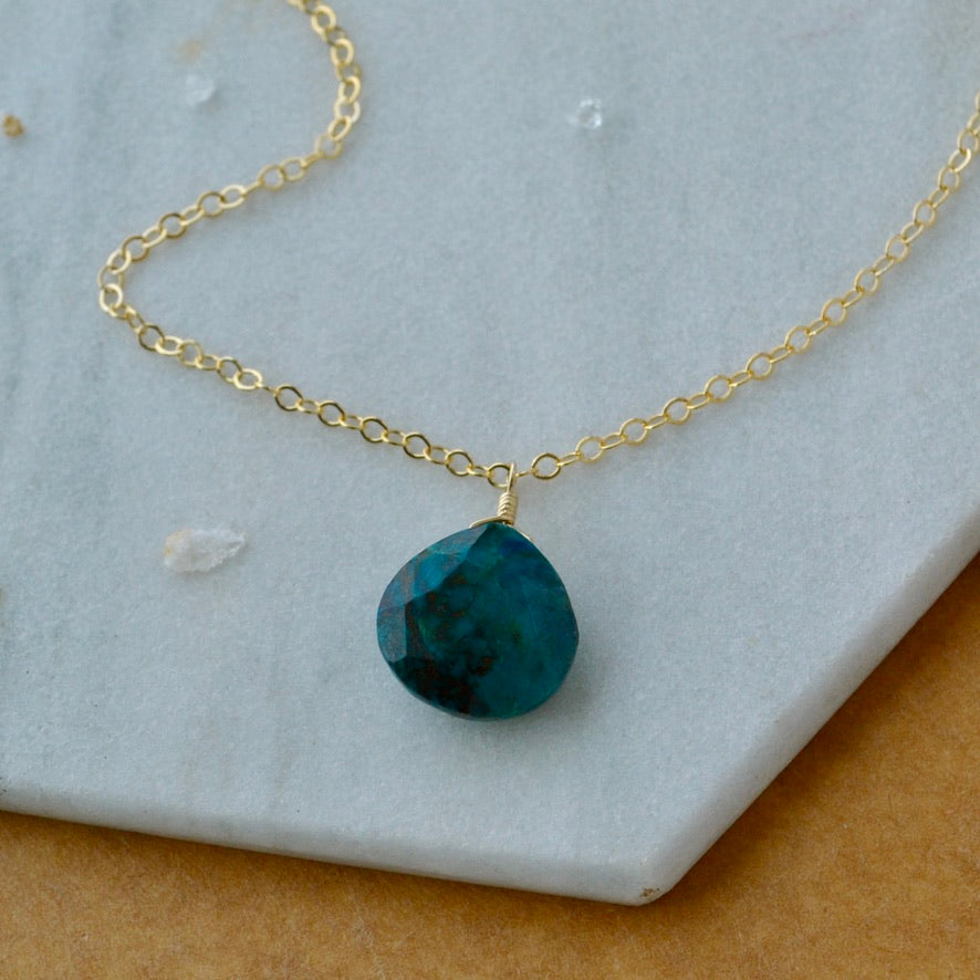 Our Reef Necklace is like the swirls of seaweed and coral in a classic solitaire necklace with modern touches. Delicate shimmering chain anchors one faceted briolette of Chrysocolla with ribbon-like bands of blue and green. The gemstone pendant is hand wire-wrapped in our signature tightrope style.