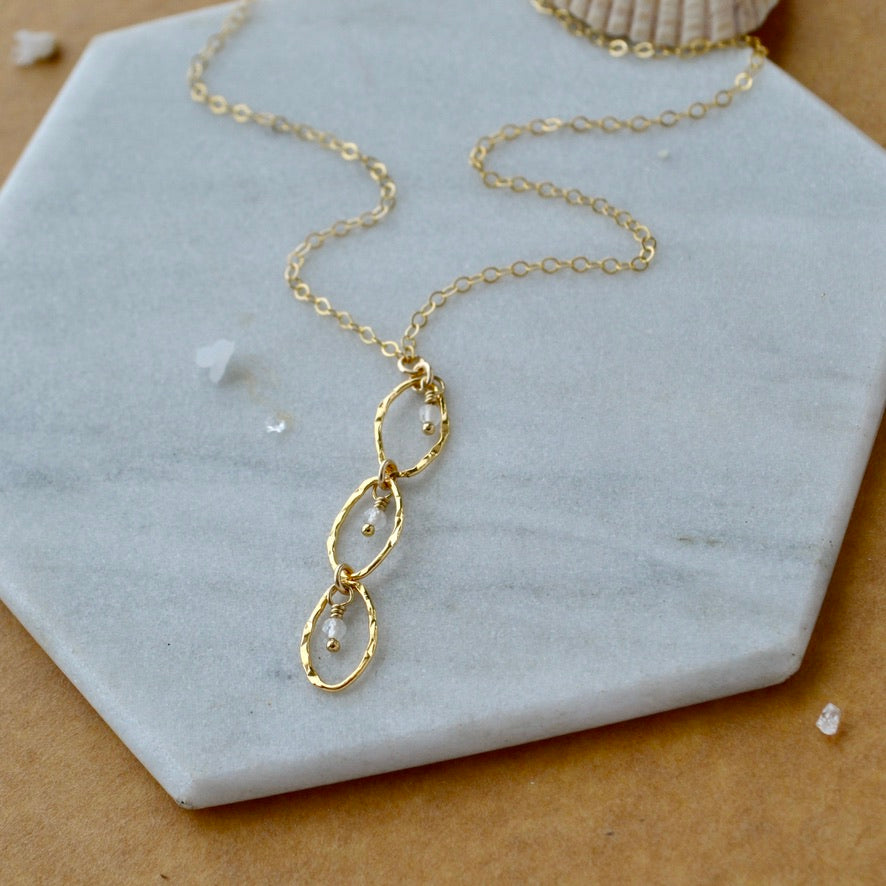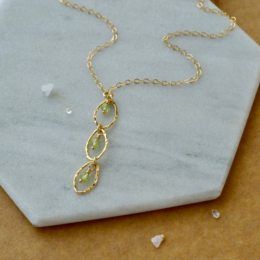 Our modern dangling Splash Necklace will add a pop of color to your look. Featuring handmade dappled marquise links with gemstones rondelle accents in a Y necklace dangling from shimmering chain. The Splash Necklace is available in your custom length with a 1.0" extender for adjustable fit.